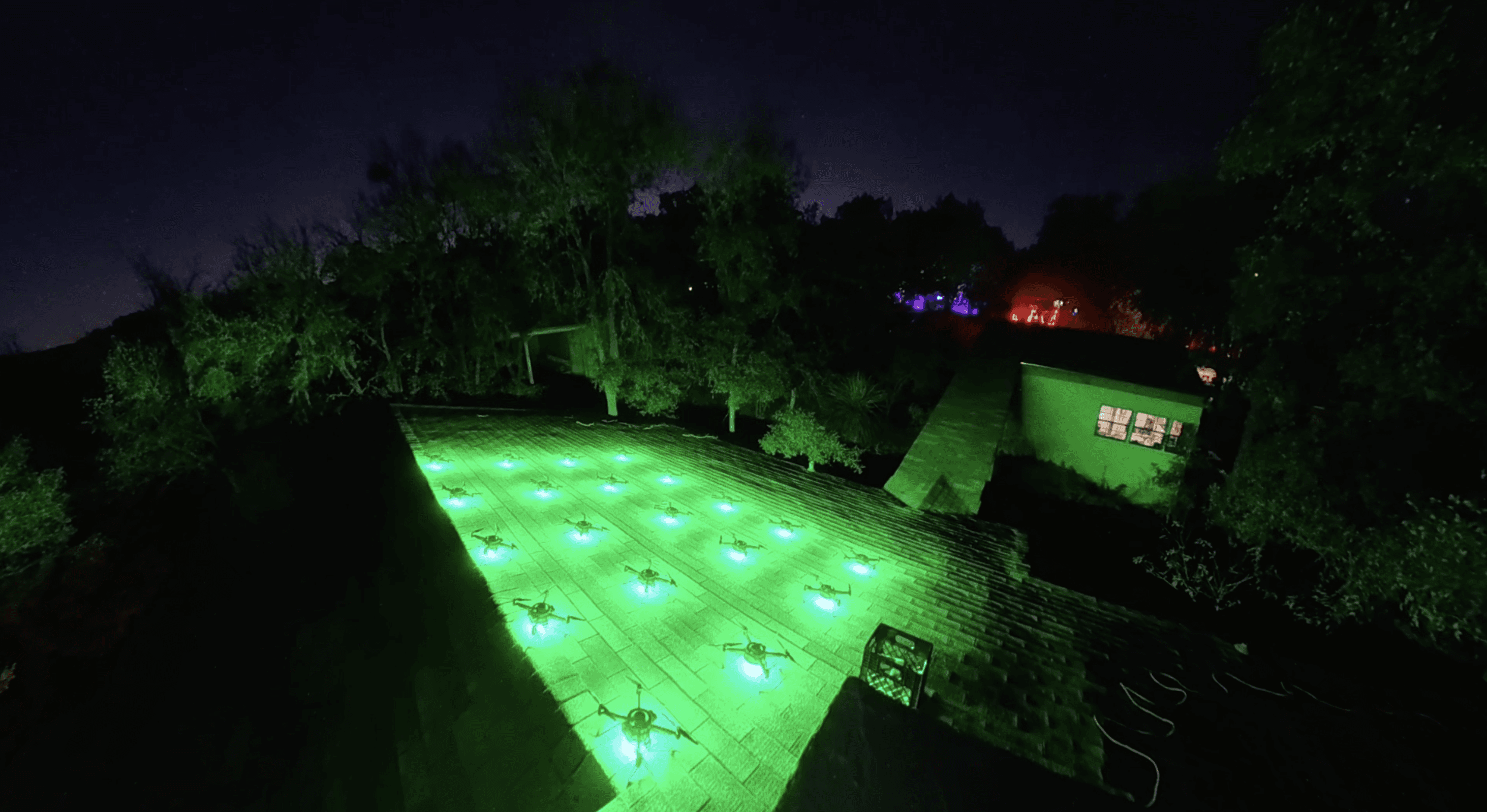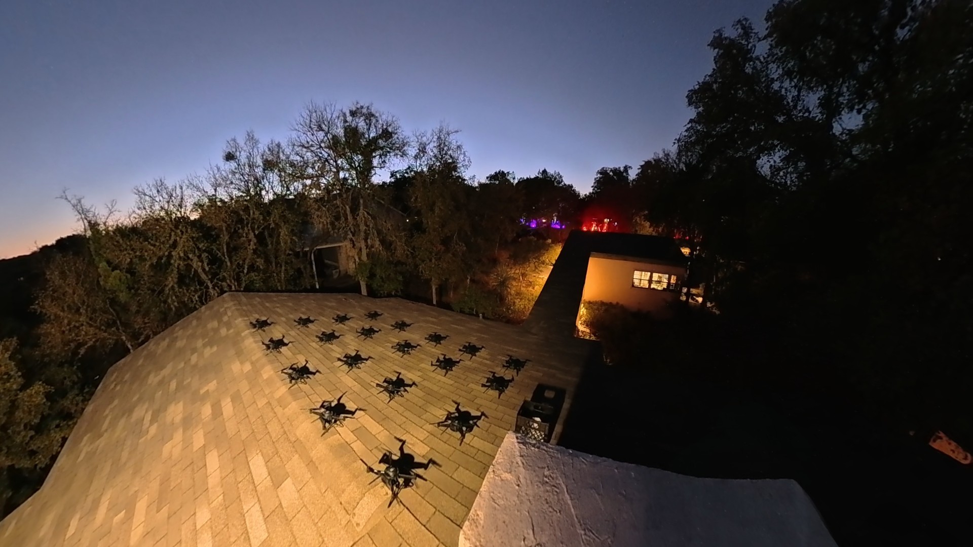 18 drones • rooftop launch/land • synced audio cues • close-range safety envelopes • quick setup/strike